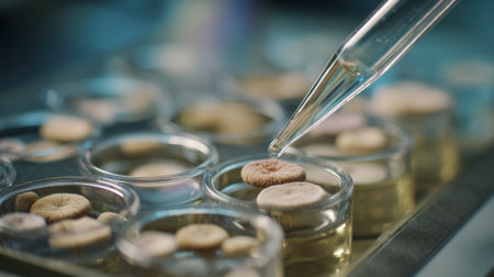 Closeup medium shot of bioinhibitors being mixed and tested on fungal samples highlighting natural compound integration in fungal protection methods.