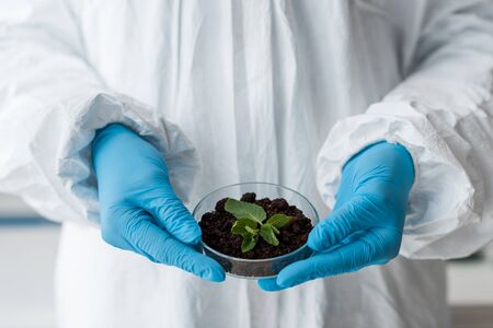 Cropped view of biologist in latex gloves holding leaves in lab