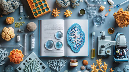 top view of book, microscope, test tubes, pills and plants on blue background