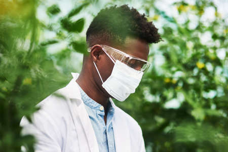 You first have to protect yourself against plant allergies. a young botanist wearing protective eye and face gear while working outdoors in nature.
