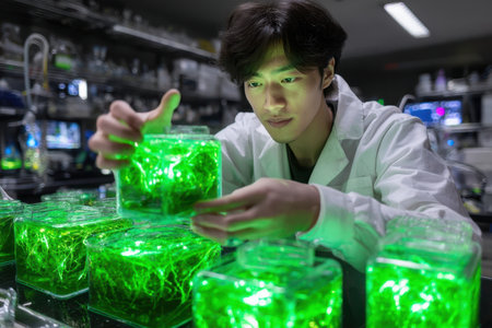 A researcher investigates bioluminescent plant samples in a lab, focusing on their unique properties and growth.