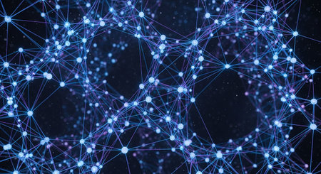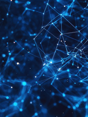 This image illustrates an abstract network of blue nodes and connecting lines against a dark background, symbolizing connectivity and advanced technology.