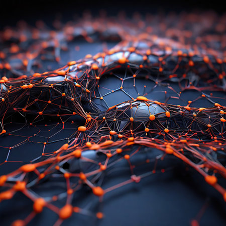 A close-up view of an abstract geometric network formed by interconnected orange lines, set against a dark blue background with scattered blue and white bokeh particles.