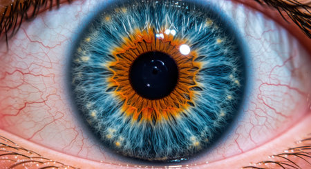 A close up of a person's eye with a blue iris and orange and yellow lines