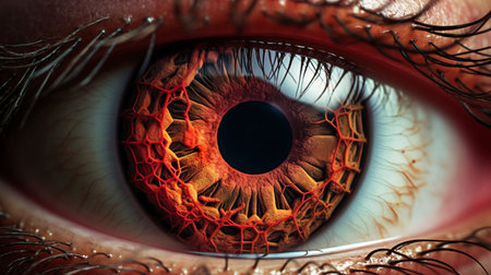This striking image captures the intricate details of a human eye, highlighting stunning textures, colors, and patterns in a dramatic close-up shot.
