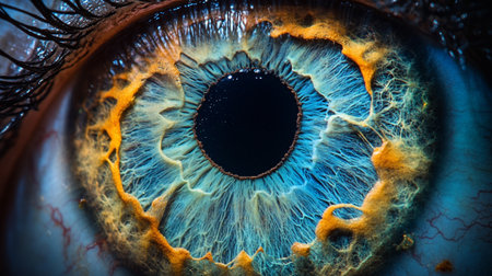 Intricate details of a vibrant human eye, showcasing blue and yellow pigmentation with reflections on the cornea. fine eyelashes frame the eye, highlighting the texture and vivid coloration of the iris and the clarity of the gaze.