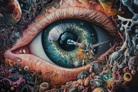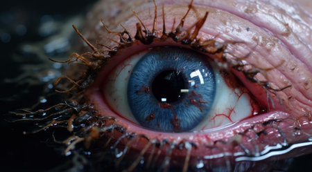 close-up of an eye with a macabre twist, reminiscent of the meticulous photorealistic still lifes by mike mignola. this haunting image combines elements of environmental installation art, medical imaging film, and the surreal works of artists like bordalo ii and tetsuya ishida. ai generated
