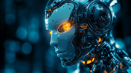 A futuristic robot head showcases glowing orange eyes and complex digital circuitry intricately designed.