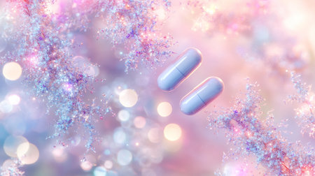 3D rendering of an abstract representation of the medicine capsule and penicillin clip with organic structures in light blue and pink colors. The background is blurred to emphasize the foreground elements, creating depth and focus. Soft lighting creates gentle shadows that enhance shapes and textures. --chaos 30 --ar 16:9 --v 6.1 Job ID: 34cd698d-1956-4c9a-865e-73e09036ad21