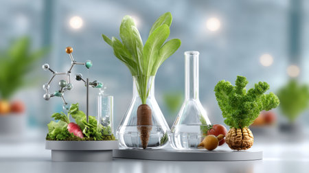 A modern laboratory scene featuring a microscope, DNA model, various glassware, and fresh plants. This clean setup highlights the intersection of nature and science.