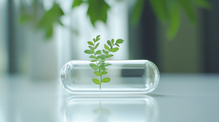 A small green plant is enclosed in a transparent glass capsule with a white scientific background, highlighting botanical preservation in a lab environment.