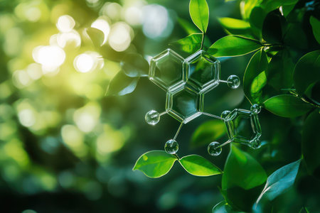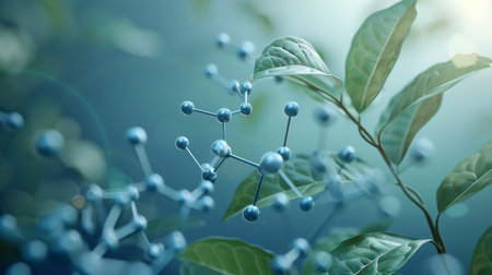 L-Theanine Molecular Structure Visualization on Blurry Green Bokeh Leaves in a Science Lab Setting
