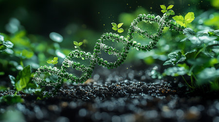 A sparkling blue DNA strand intertwined with lush green leaves, representing the connection between genetics and nature.