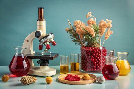 A visually striking arrangement of fresh herbs and scientific tools, featuring DNA imagery, representing the fusion of nature and science in research.