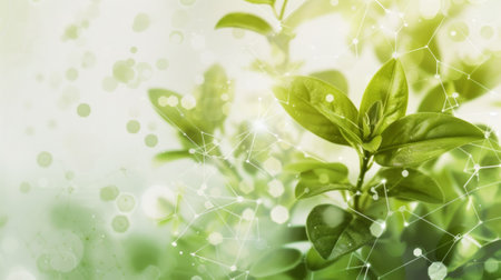 A close-up of green plants with glowing, futuristic holographic health supplement pills floating above them, representing the natural and modern connection between nature's ingredients in hexagonal patterns, all set against an abstract background with soft lighting to highlight their details. The colors should be bright greens for energy to create depth and contrast, with a slight glow effect on some highlights. --ar 23:10 --v 6.1 Job ID: 76451aaf-d2b2-4854-ad92-707b637c6ff6