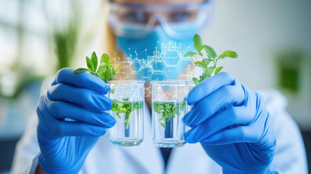 A scientist in gloves and goggles analyzes plant growth in a laboratory, holding vials with green samples, showcasing the intersection of biotechnology and environmental research.