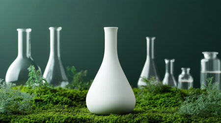 A stylish white vase stands out in a serene setting with glass lab equipment arranged on lush green moss, creating a harmonious blend of nature, art, and science.