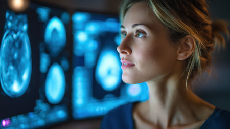 A young woman in glasses closely observes brain scans displayed on large screens in a high-tech research environment. The focus is on the detailed images and her concentration.