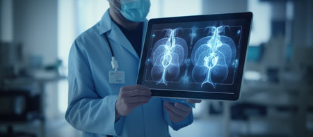 Doctor showing x-ray image of lungs on digital tablet in hospital