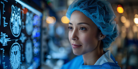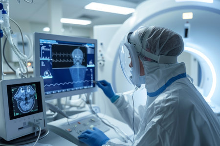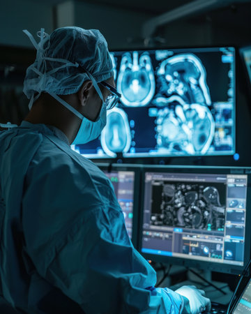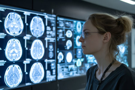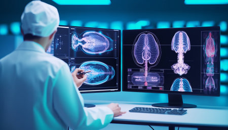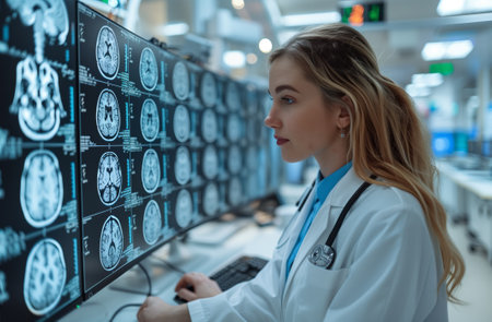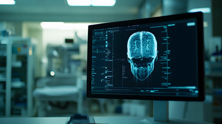 Medical diagnostic screens display detailed brain MRI scans, highlighting AI's role in enhancing precision and speed in healthcare diagnostics