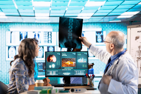 Physicians talking with specialist doctors during medical conference. Expert doctor using modern technology, pointing on digital radiography brainstorming with medicine staff for expertise.