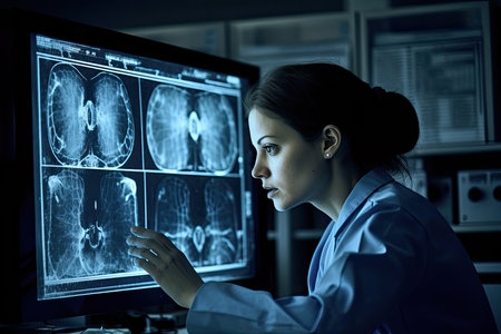 a woman looking at an x - ray image on a computer screen in front of her, she is wearing a white lab coat