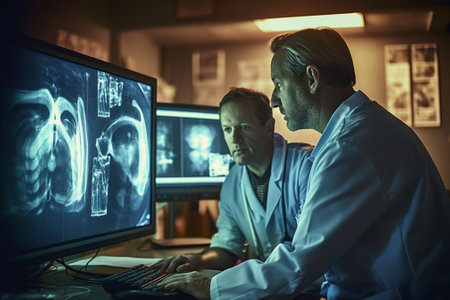 Doctor and patient looking at x - ray image on computer screen. Generative AI.