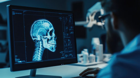 A medical professional examining a digital X-ray image of a human skull on a computer screen, with a focus on the features and diagnostic tools.
