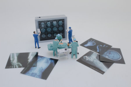 Professionally dressed miniature figures of medical professionals examining