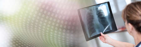 Female doctor examining x-ray report in medical office; panoramic banner