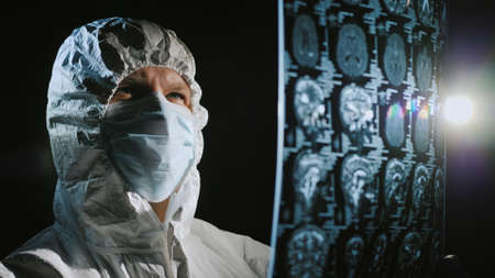 Doctor in protective clothing looks at the results of the patients examination