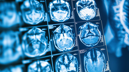Closeup showing brain MRI scans displayed on medical monitor in hospital radiology department, highlighting detailed cross-sectional images of human skull and brain structures