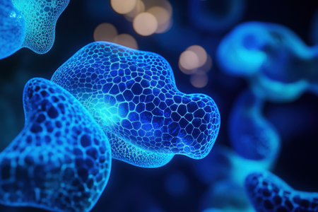 A stunning macro image captures a network of interconnected, glowing blue cells against a deep black backdrop, revealing intricate details.