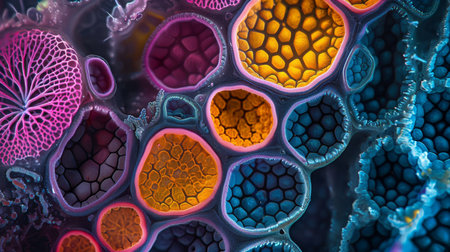 A vibrant close-up of cellular structures showcasing intricate patterns and textures in a mesmerizing interplay of colors.