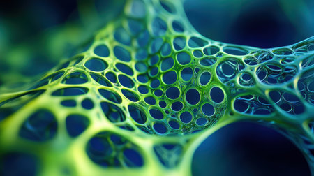 Detailed view of complex green cellular structures reveals unique textures and patterns, illuminated by blue light, showing natural beauty and scientific marvel.