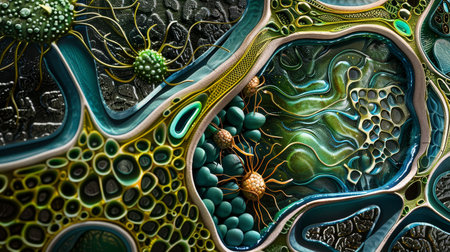 Discover a vibrant abstract microstructure showcasing cells and biological elements, illuminated with stunning colors and intricate patterns that evoke creativity.