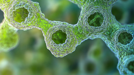 Microscopic view of vibrant green algae, close-up, biofuel concept, scientific detail.