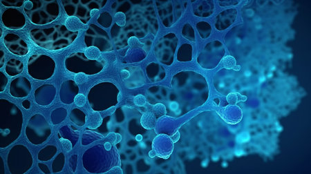 A macro illustration of blue lung alveoli against a dark background, AI-generated