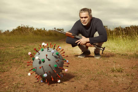 Young male gangster or criminal in a medical surgical mask and sunglasses dressed in black clothes with a hood holds an automatic assault weapon