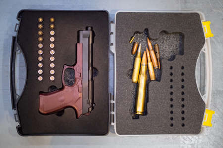 Cartridges. Pistol. The gun next to the cartridges. Weapons Suitcase for the pistol. Buying weapons. Cartridges of different calibers next to the pistol. Case for weapons. Gun storage. Collection gun