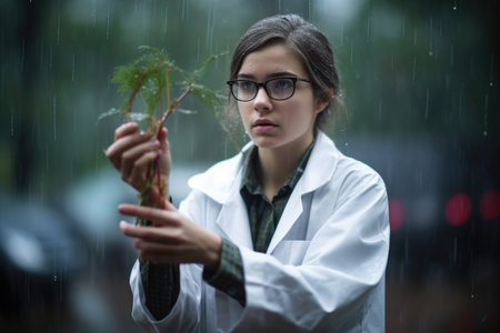 shot of a young female biologist holding up a plant specimen while working in the rain, created with generative ai