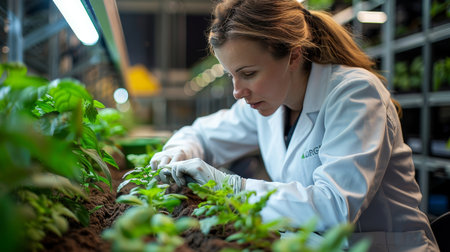 A woman wearing a lab coat and goggles carefully examines plants in a laboratory setting, Woman scientist altering plant DNA, AI Generated