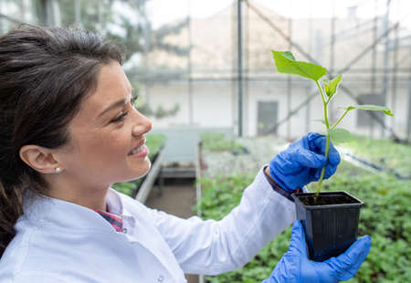 Botanist researcher woman examining green sapling observing genetic mutation analyzing organic plants for agriculture experiment. Chemist working in biological pharmaceutical laboratory.