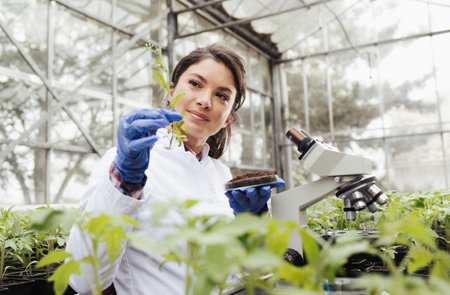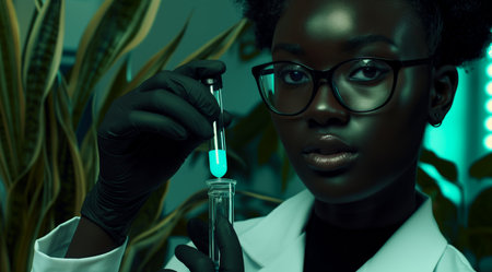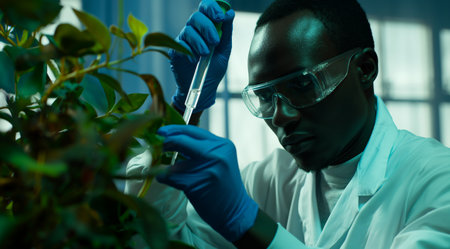 Biologist conducts experiments experimenting with plant breeding by synthesising compounds, with use of a test tube in a Laboratory