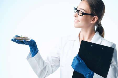 DNA. A woman scientist in a laboratory examining the soil. Concept: analysis, DNA, bio, microbiology, augmented reality, biochemistry, immersive technology