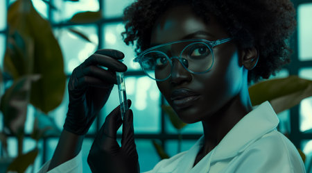 Concentrated view of doctor african scientist holding glass microscope glass. Black healthcare scientist in biochemistry laboratory wearing sterile equipment.