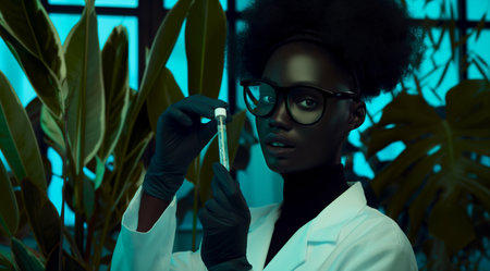 A scientist wearing white gloves carefully examines vibrant plant samples inside a test tube, showcasing a blend of nature and research in a lush laboratory environment.
