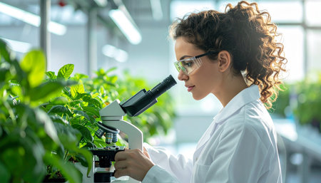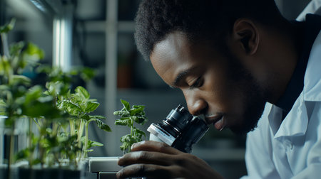 Young scientist examining plant specimens under microscope in modern botanical research laboratory surrounded by green plants and scientific equipment.