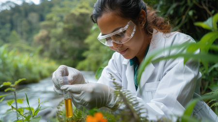 Researcher examines water samples in a tropical rainforest during a scientific study on ecosystem health