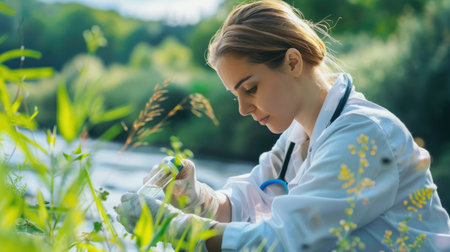 An environmental scientist in protective gear collects a water sample from a riverbank, focusing on assessing pollution levels and ensuring ecosystem health.